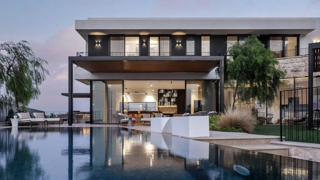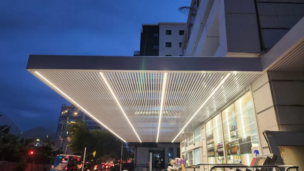 הפרגולה “מרחפת” בזכות תכנון הנדסי חכם ונקודות עיגון נסתרות, ויוצרת תחושת יוקרה ואדריכלות מתקדמת.